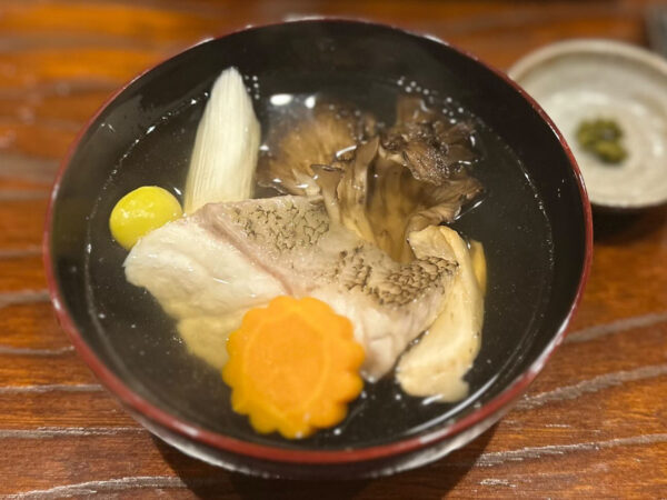小田原から直送される極上クエの溢れる旨味と舞茸のコリコリ食感と香り。自家製の柚子胡椒を添えてアクセントを加えます。