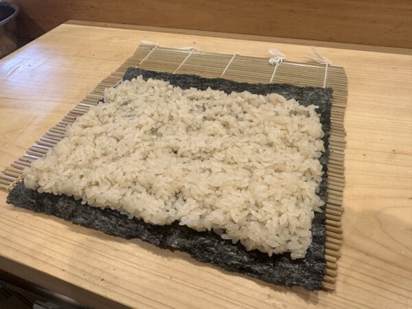 ①海苔全体にシャリを均一に置く。まずはこの形を目指しましょう。